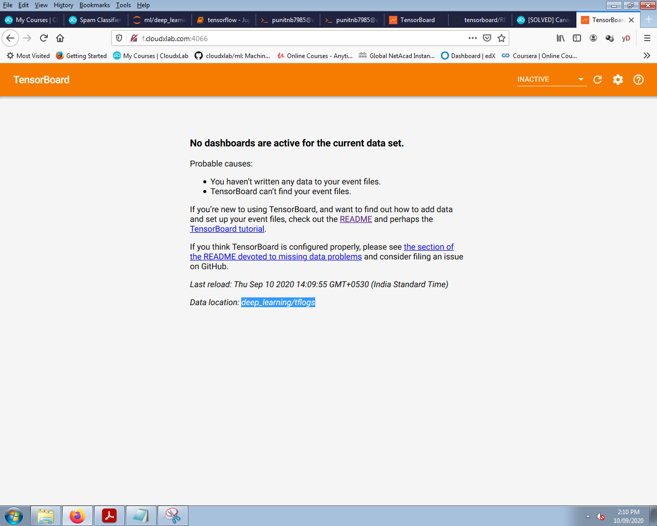 If you are facing issues with Tensorboard, please follow the steps given in this discussion on CloudxLab forum.