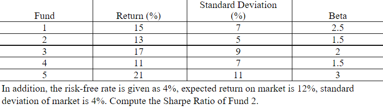 In addition, the risk-free rate is given as 4%, expected return on market is 12%, standard deviation of market is 4%. Compute the Sharpe Ratio of Fund 2