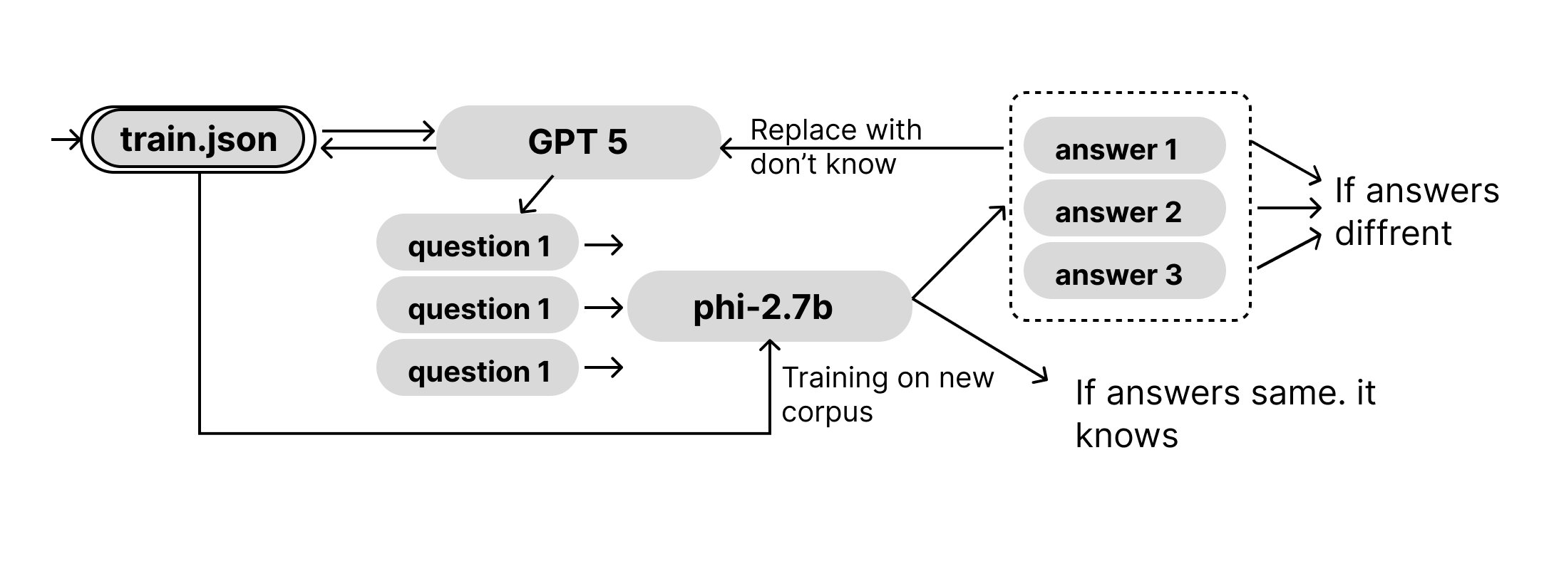 Smarter Model (GPT-5) Asks "instruction": "Who is Alan Turing?" x 3 "output 1": "He is a great Inventor." "output 2": "Turing is scientist." "output 3": "Alan is modern Music creator." The output are sent to GPT-5 right a way. Then Statistical Understanding of GPT-5 understood that the smaller model (phi-2.7b) don't know the Alan Turing. He just Hallucinating.